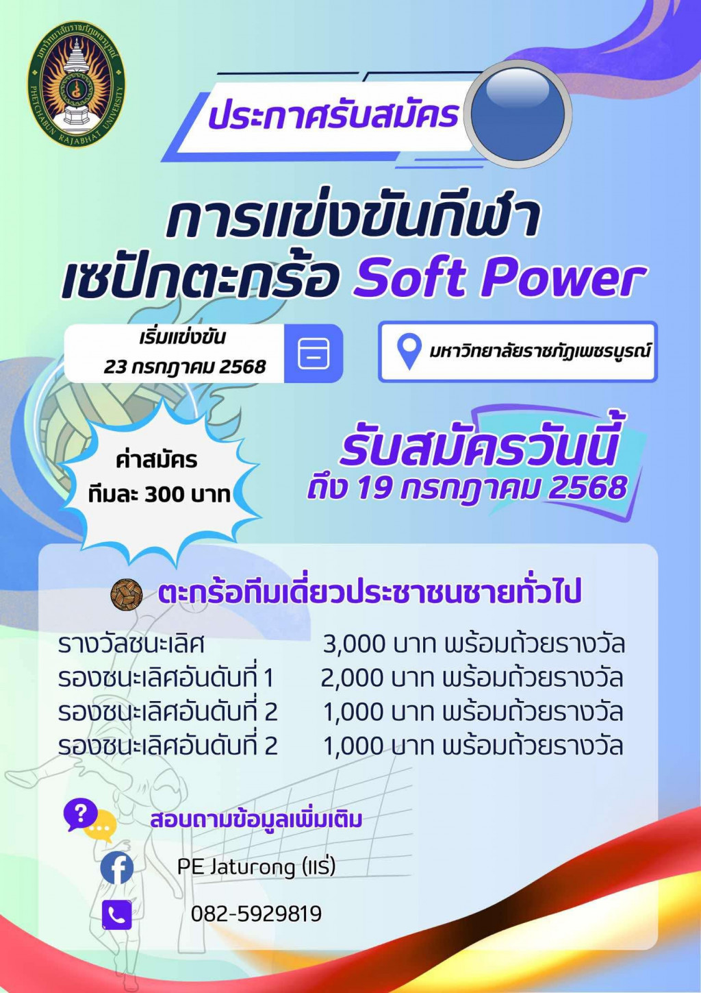 #เซปักตะกร้อSoftPower #กีฬาเพื่อสุขภาพ #ราชภัฏเพชรบูรณ์ #ประชาชนทั่วไปก็สมัครได้ #กีฬาเชื่อมใจไทยทั้งชาติ ![]()